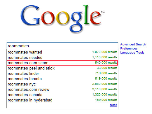 Pretty crazy suggestion right on the third spot, especially when you consider that Roommates.com is a legitimate company and the keyword above is not even for Roommates.com, but rather for the general term “roommates”. Google Suggest Optimization is probably something that the SEO community should look into.