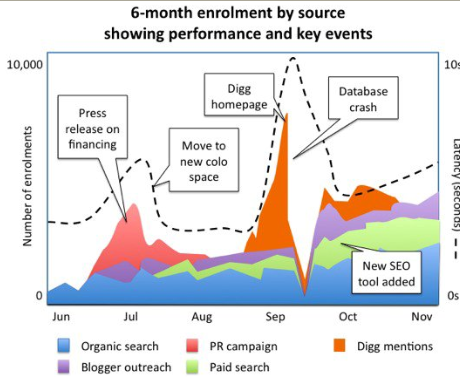 That said…I saw an intresting graph over at Marshall’s blog: the 6-month performance an key events report (see below). What a beautiful graph to show how a website is doing! I hope one of the vendors pick up the idea and generate a dashboard report, which not only displays the webanalytics data and 3rd party products (via API), but also allows the user to include key events such as “Database crash” or “New SEO tool added”.